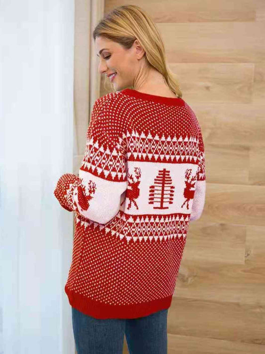 Christmas Tree Round Neck Ribbed Trim Sweater