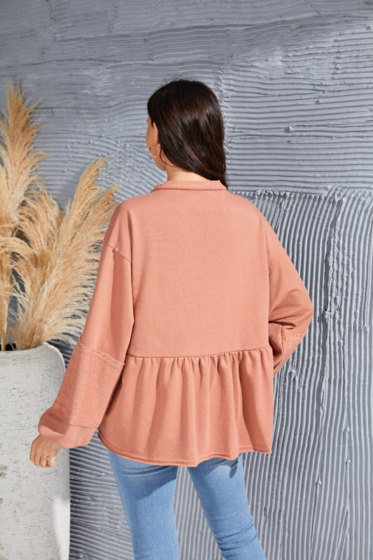 Plus Size Printed Ruffle Trim Long Sleeve Blouse