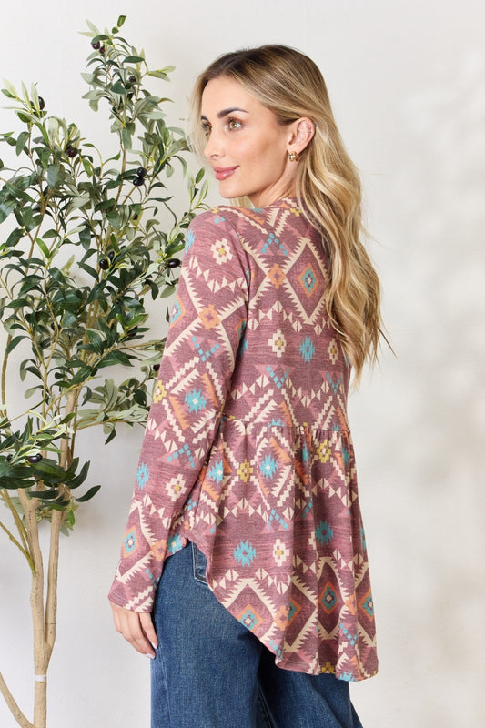 Heimish Full Size Geometric V-Neck Babydoll Top