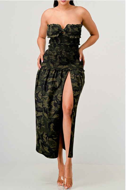 ATHINA DARK CAMO PRINT FRONT SLIT DRESS