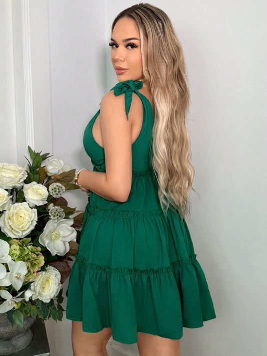 Tie Shoulder Plunge Sleeveless Tiered Dress