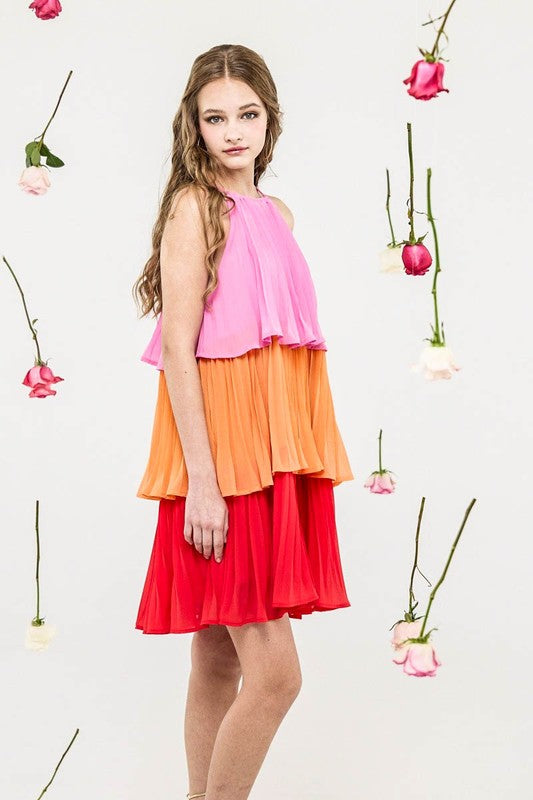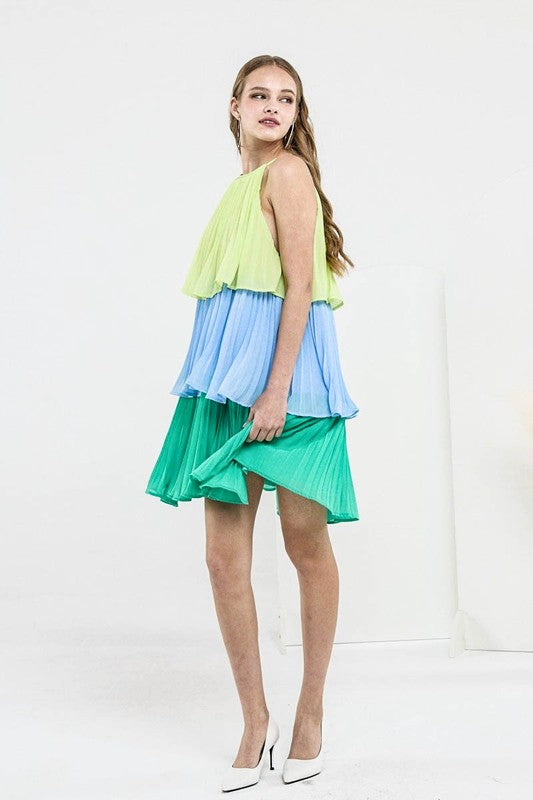 Tiered Pleated Swing Halter Mini Dress