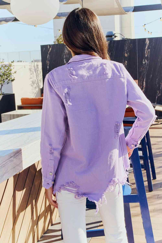 American Bazi Full Size Distressed Button Down Denim Jacket in Lavender