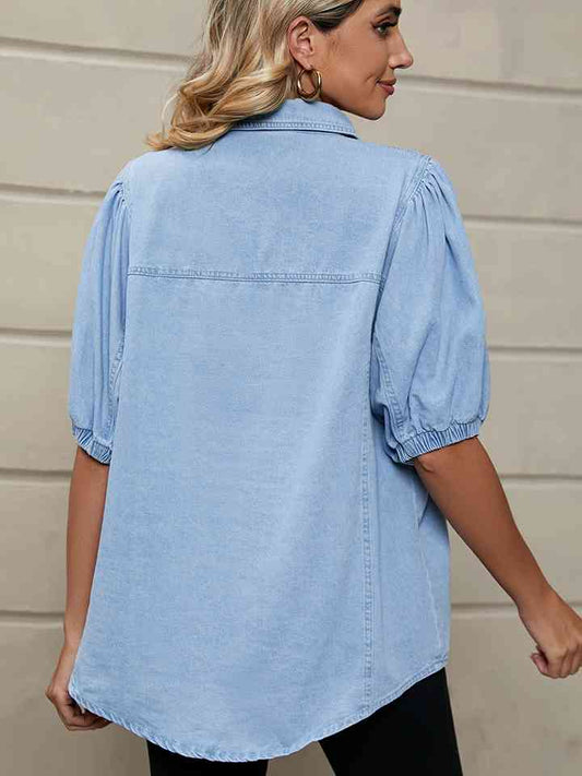 Doublju Blue Jean Baby Denim Button Down Shirt Top in Light Blue