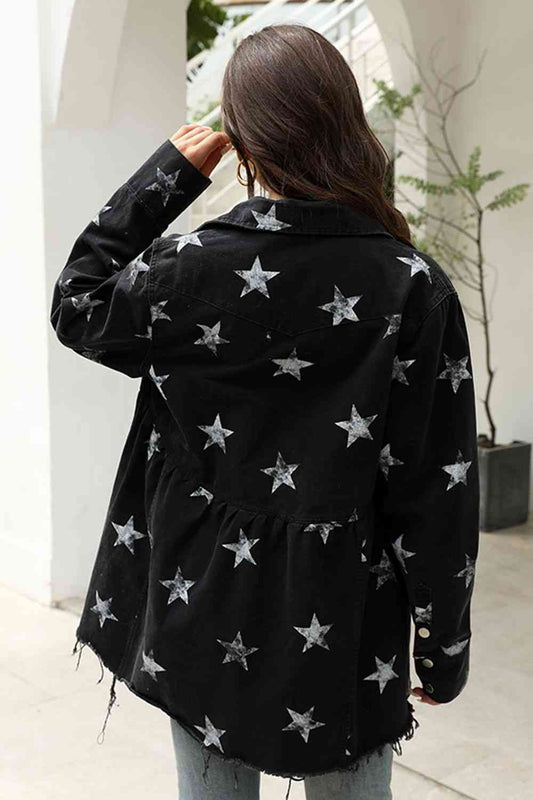 Collared Neck Star Print Long Sleeve Denim Jacket