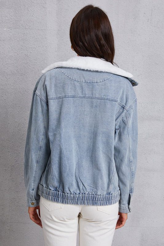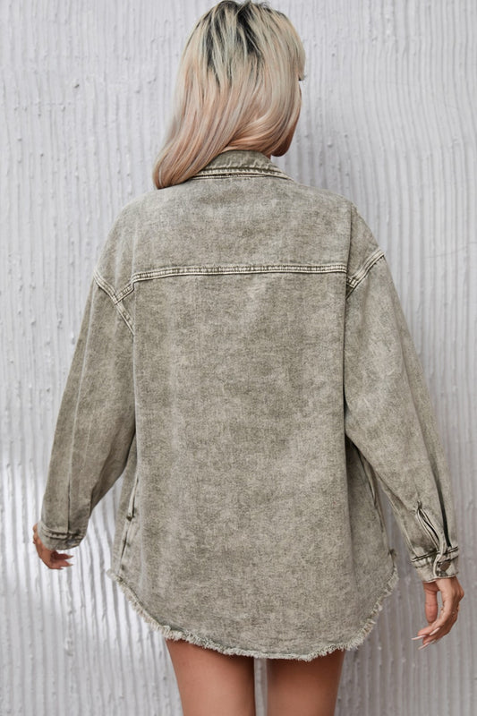 Raw Hem Pocketed Collared Neck Denim Jacket
