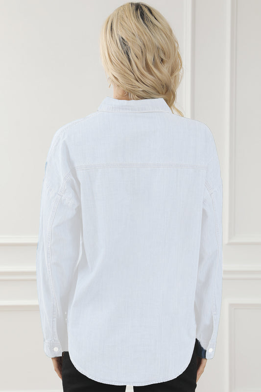 Pearl Detail Collared Neck Long Sleeve Denim Jacket