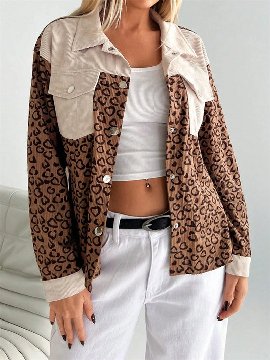 Leopard Print Color Block Corduroy Jacket