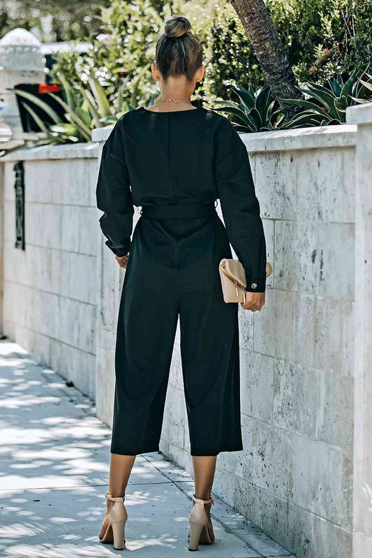 Belted Long Puff Sleeve V-Neck Jumpsuit