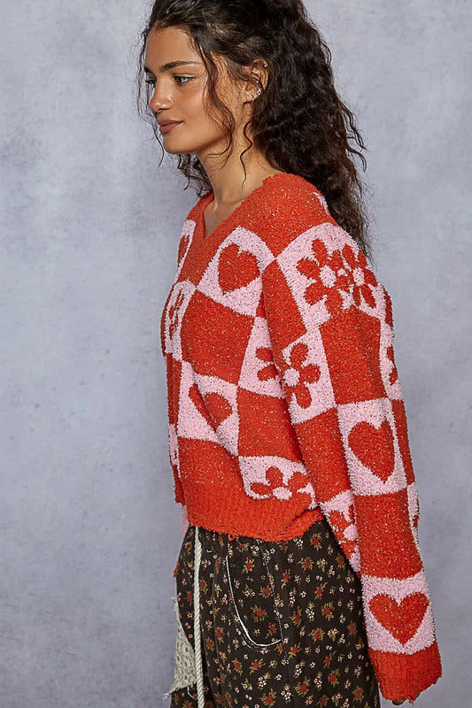 Regular price $105.60 USDRegular priceUnit price / per$105.60 USDSale price $105.60 USDPOL V-Neck Heart Pattern Checkered Sweater