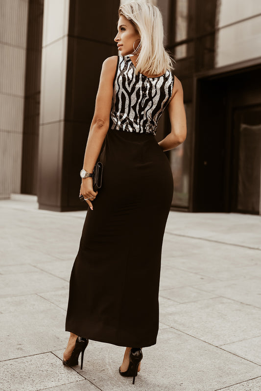 Two-Tone Sequin Sleeveless Plunge Maxi Dress