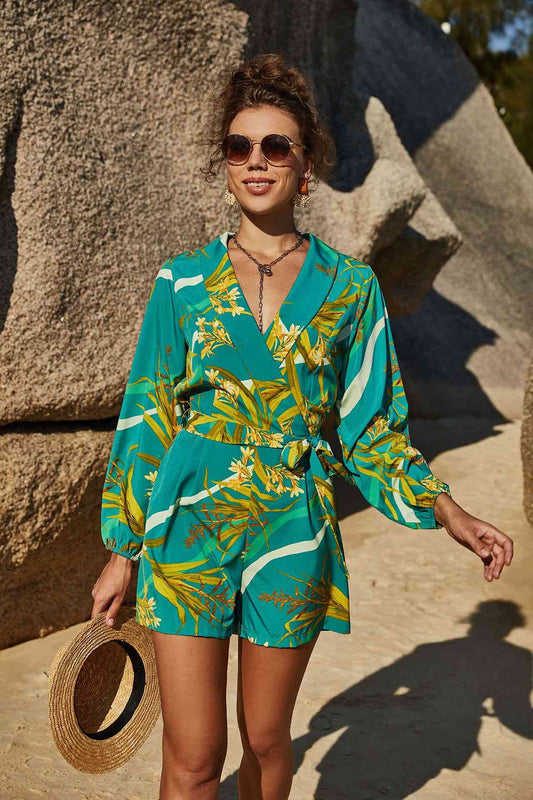 Plus Size Floral Tie Neck Balloon Sleeve Romper