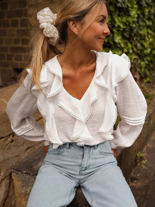 Regular price $64.56 USDRegular priceUnit price / per$64.56 USDSale price $64.56 USDRuffle Trim V-Neck Blouse