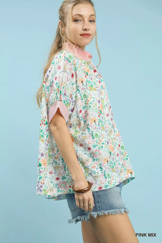 Umgee Floral Print Puff Sleeve Blouse with Scallop Hem