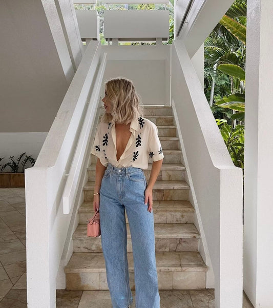 Regular price $24.50 USDRegular priceUnit price / perSale price $24.50 USDSummer Women Clothing Retro Design Niche Short Sleeve Collared Positioning Printed Shirt