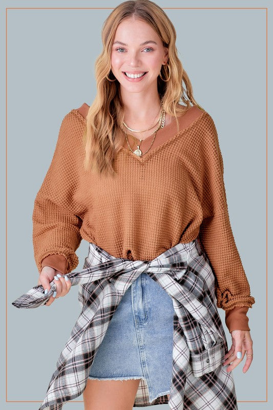 Waffle Knit Side Slit Drop Shoulder Sweatshirt
