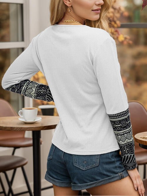 Geometric Waffle-Knit Buttoned Round Neck T-Shirt