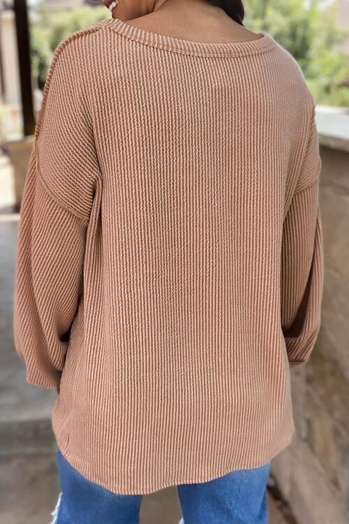Waffle -Knit V-Neck Long Sleeve Blouse