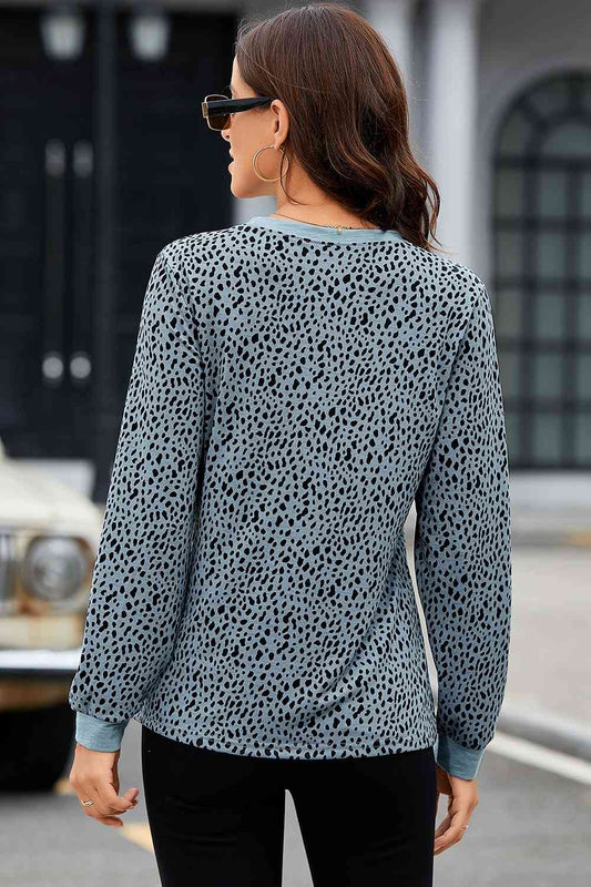 Leopard Exposed Seam Buttoned Round Neck Blouse