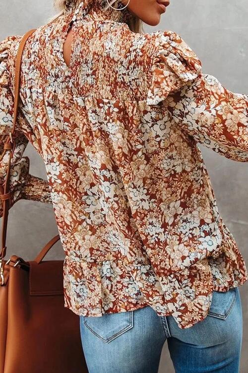 Floral Smocked Lantern Sleeve Ruffled Blouse