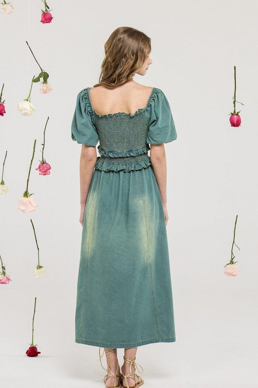 Denim Off Shoulder Puff Sleeves Smocked Dress