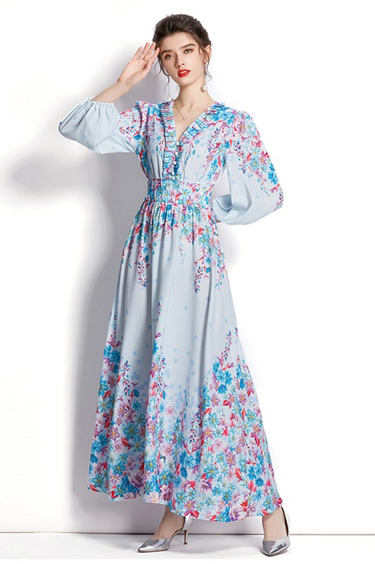 Printed Single Shoulder Lantern Sleeve Maxi Dress