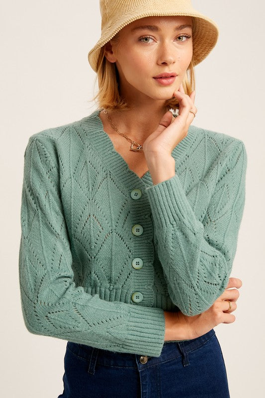 V-neck Scallop Edge Button Down Crop Knit Cardigan