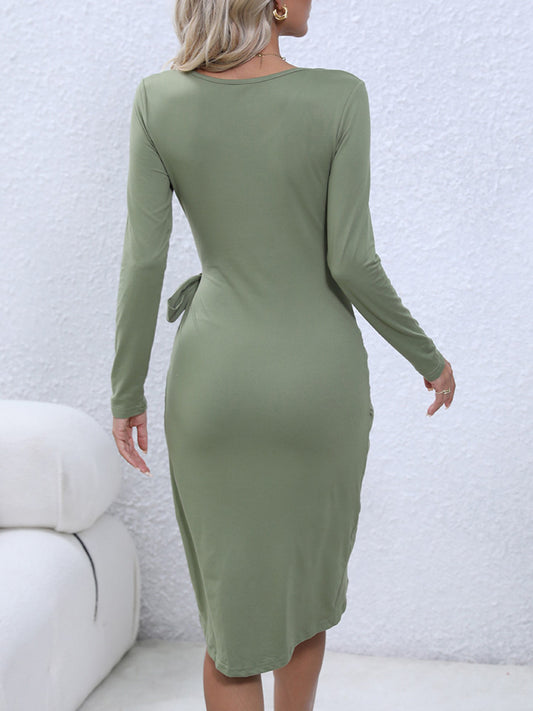 V-Neck Long Sleeve Tie Waist Midi Dress