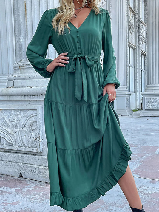 Ruffled Hem V-Neck Balloon Sleeve Dress