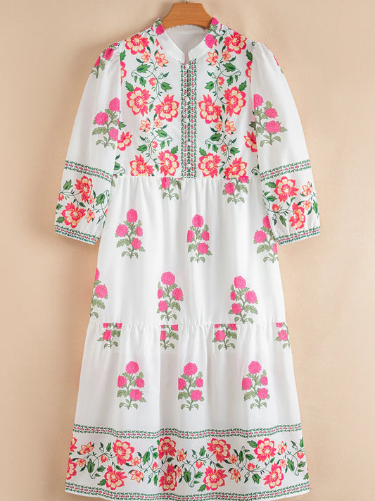 Floral Print Half Button Mandarin Neck 3/4 Sleeve Maxi Dress