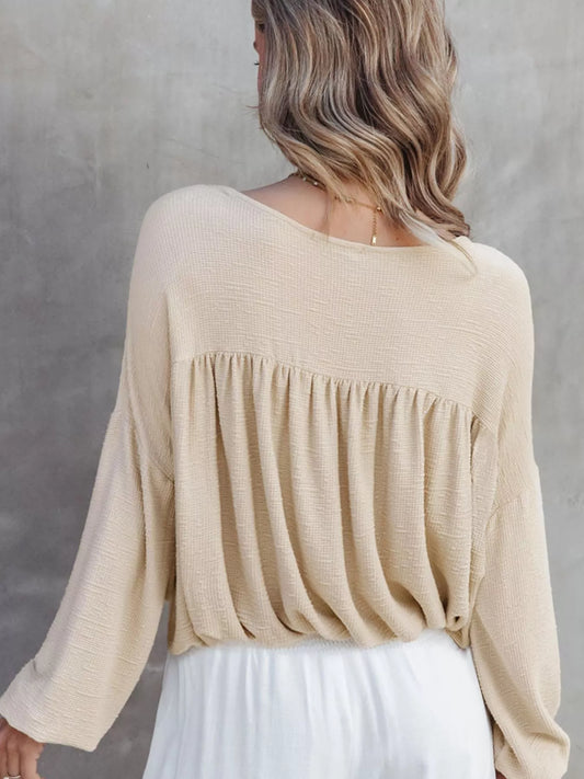 Umgee Full Size Textured Notched Balloon Sleeve Blouse Plus Size