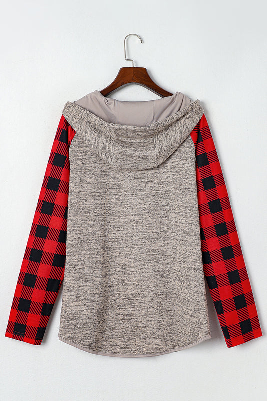 Drawstring Plaid Half Zip Raglan Sleeve Hoodie