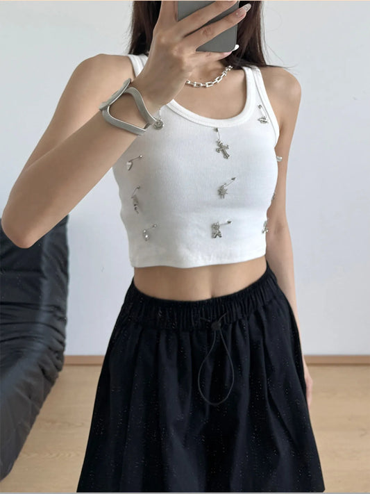 Brooch Embellished Ribbed Tank Top