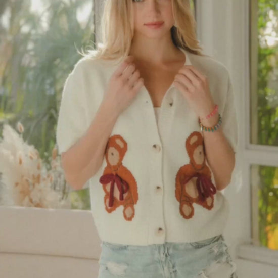 This charming cream-colored cardigan features an eye-catching teddy bear embroidered design that adds a playful touch to any outfit. Made from soft knit fabric, it offers comfortable wear with a relaxed fit. The classic button-front closure and short sleeves make it perfect for layering or wearing alone. The novelty teddy bear print creates a cute and fashion aesthetic, while the neutral cream base ensures versatility with various wardrobe pieces. Ideal for casual outings, this cardigan combines comfort with whimsical style.