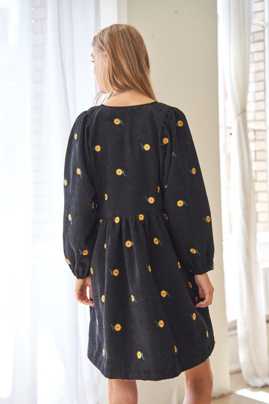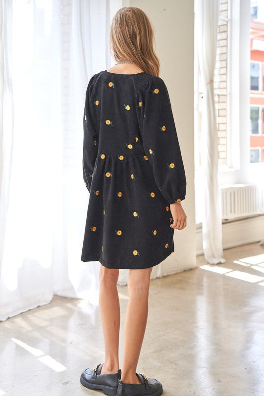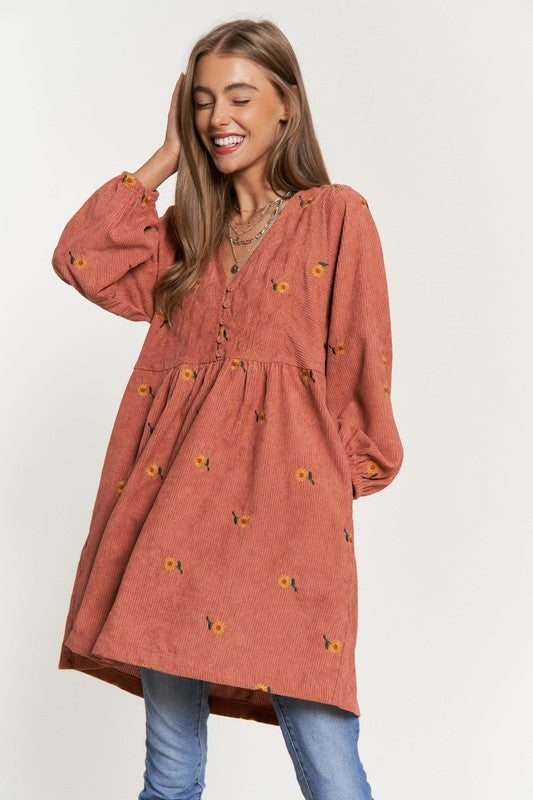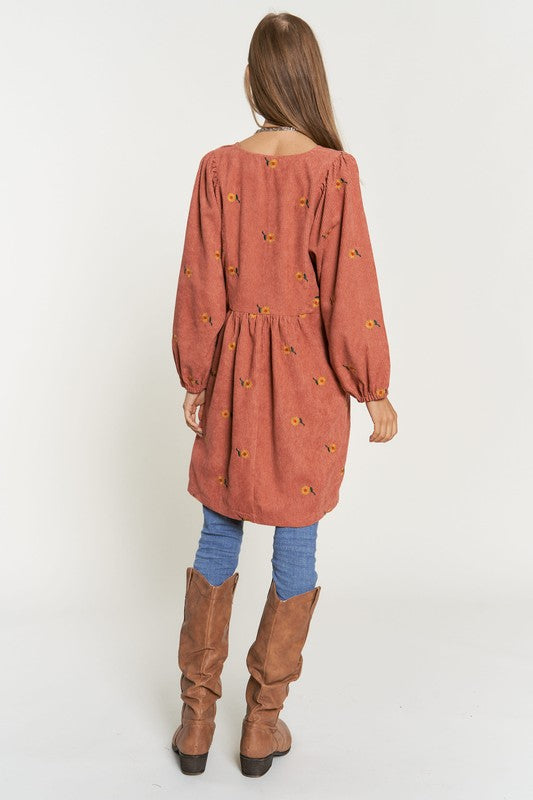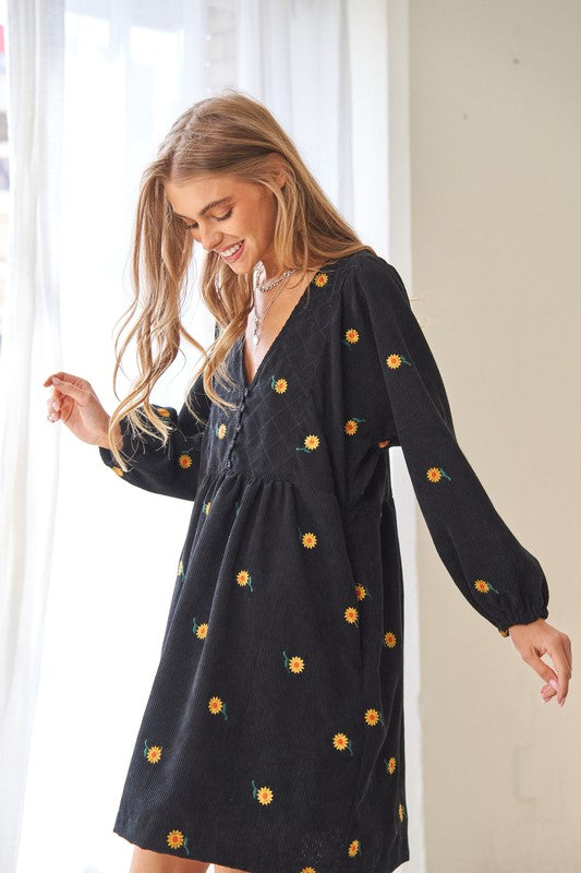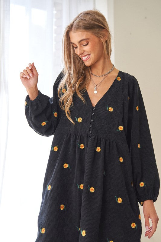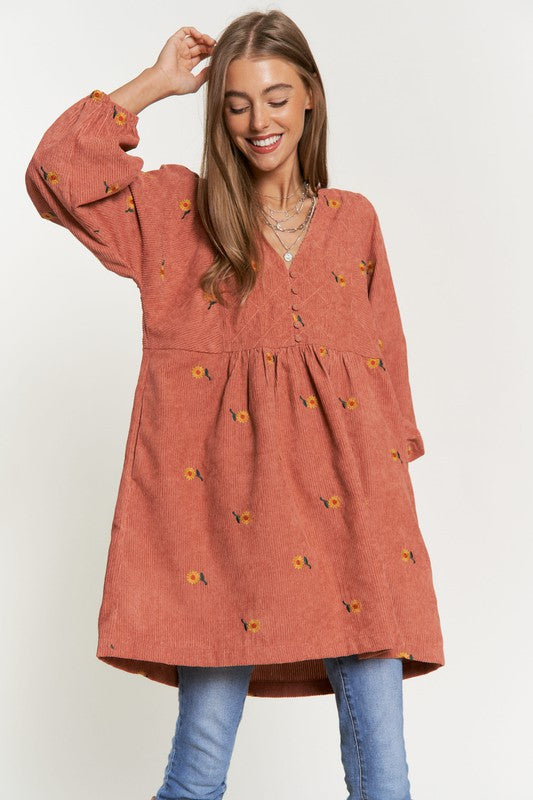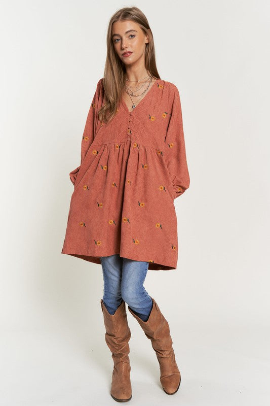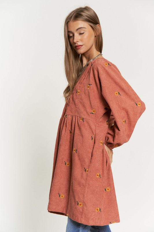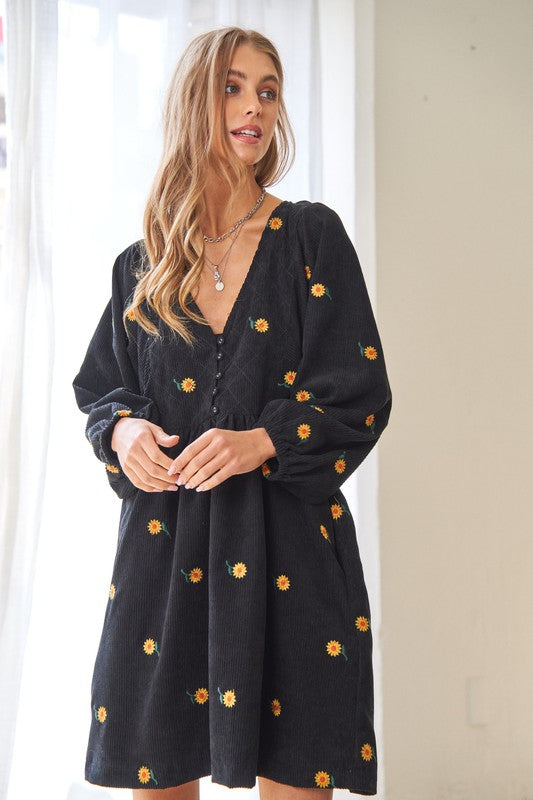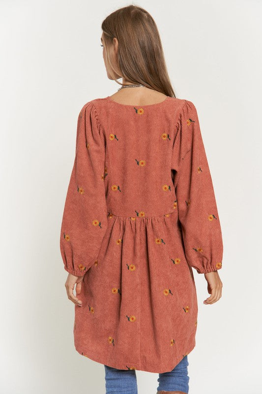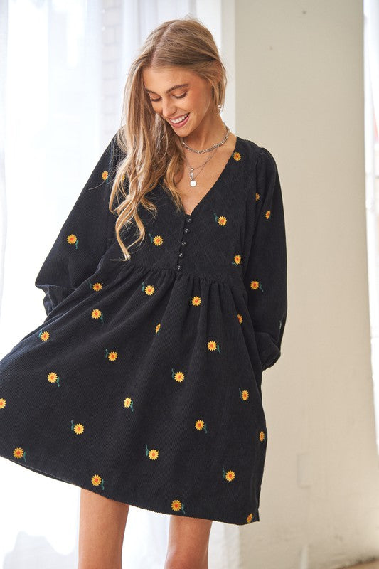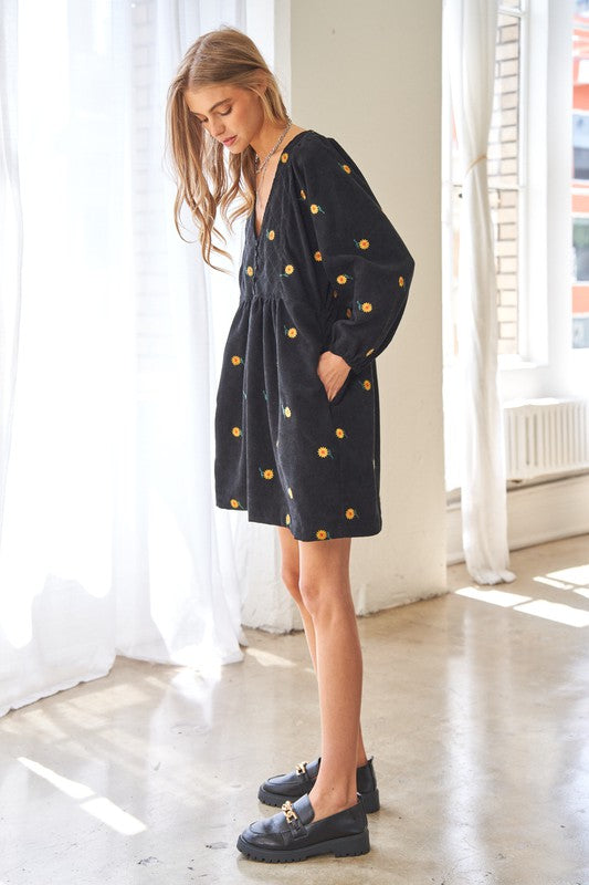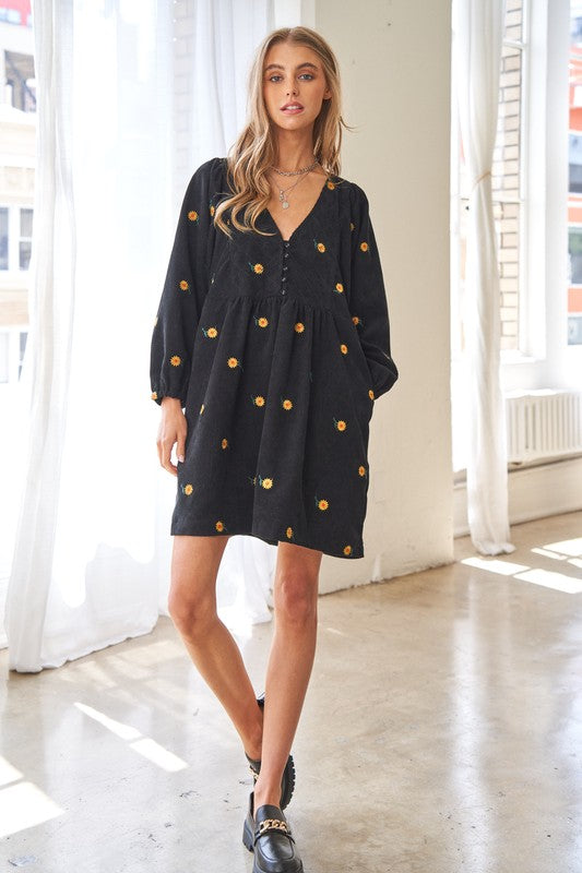 This dress is a harmonious blend of vintage-inspired charm and modern elegance. The corduroy fabric adds texture and warmth, while the embroidered quilted bib detail adds a touch of intricate beauty to the dress. The Henley-style neckline adds a classic touch with its button-down design, and the mini length creates a youthful and playful vibe.