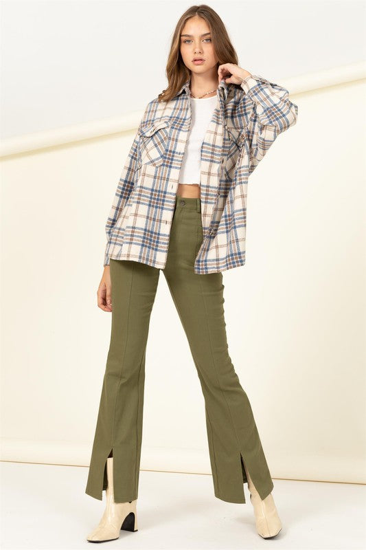 Elevate your seasonal style with this chic checkered print button-front top. Featuring an all-over checker print, it is adorned with a collared neckline and long sleeves with button cuffs. The front button closure adds to the style, finished off with front flap pockets.