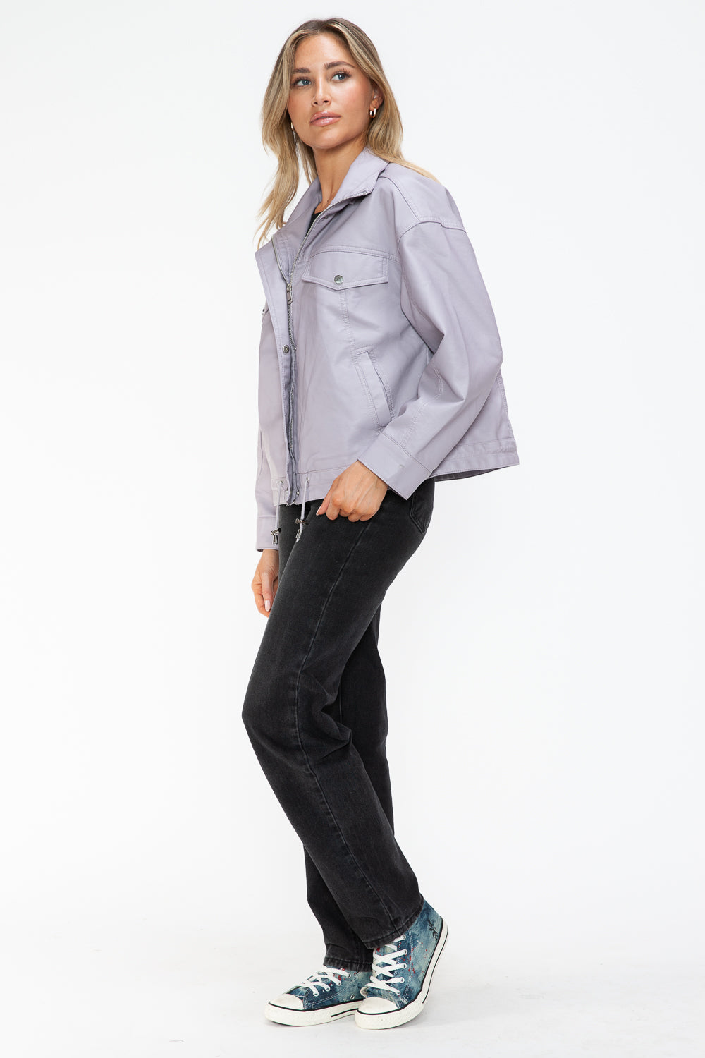 How Dare U Drawstring Hem PU Leather Zip Up Jacket